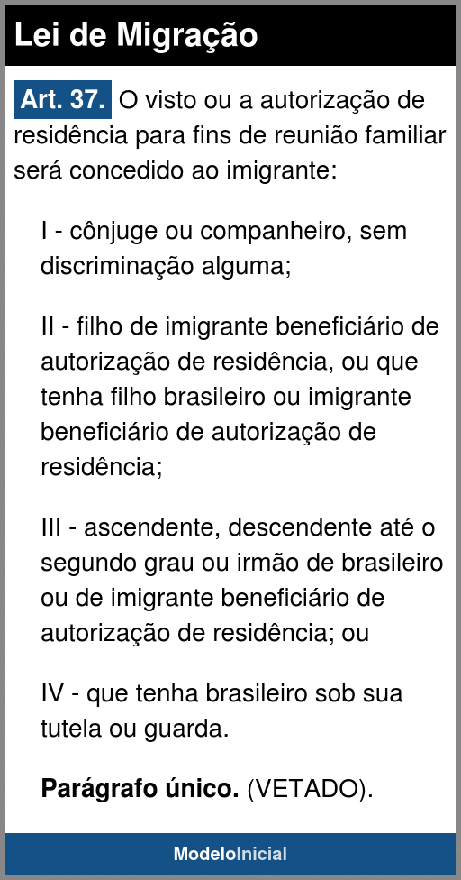 Art. 37. O visto ou a autorização de residência para fins de reunião familiar será concedido ao imigrante:
