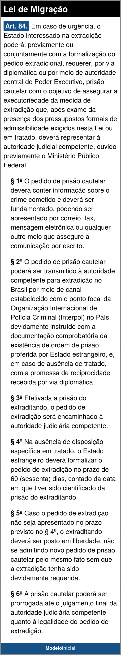 Art. 84. Em caso de urgência, o Estado interessado na extradição poderá, previamente ou conjuntamente com a formalização do pedido extradicional, requerer, por via diplomática ou por meio de autoridade central do Poder Executivo, prisão cautelar com o objetivo de assegurar a executoriedade da medida de extradição que, após exame da presença dos pressupostos formais de admissibilidade exigidos nesta Lei ou em tratado, deverá representar à autoridade judicial competente, ouvido previamente o Ministério Público Federal.