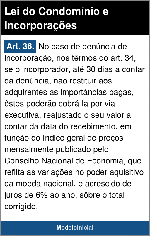 Art. 36. No caso de denúncia de incorporação, nos têrmos do art. 34, se o incorporador, até 30 dias a contar da denúncia, não restituir aos adquirentes as importâncias pagas, êstes poderão cobrá-la por via executiva, reajustado o seu valor a contar da data do recebimento, em função do índice geral de preços mensalmente publicado pelo Conselho Nacional de Economia, que reflita as variações no poder aquisitivo da moeda nacional, e acrescido de juros de 6% ao ano, sôbre o total corrigido.