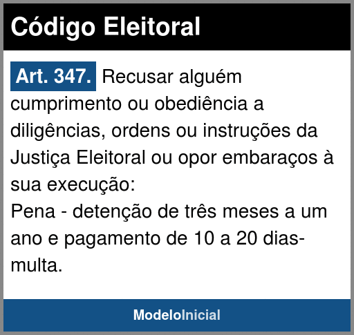 Art. 347. Recusar alguém cumprimento ou obediência a diligências, ordens ou instruções da Justiça Eleitoral ou opor embaraços à sua execução:
