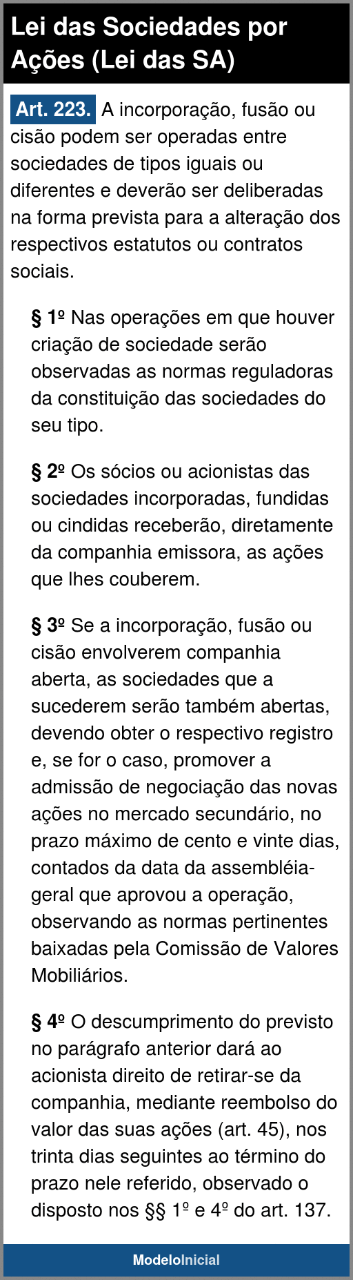 Art. 223. A incorporação, fusão ou cisão podem ser operadas entre sociedades de tipos iguais ou diferentes e deverão ser deliberadas na forma prevista para a alteração dos respectivos estatutos ou contratos sociais.