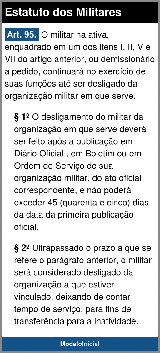 Art. 95. O militar na ativa, enquadrado em um dos itens I, II, V e VII do artigo anterior, ou demissionário a pedido, continuará no exercício de suas funções até ser desligado da organização militar em que serve.