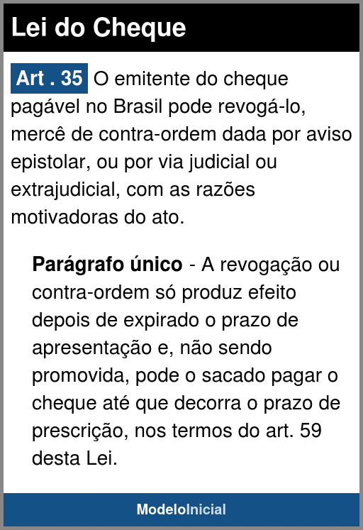 Art . 35 O emitente do cheque pagável no Brasil pode revogá-lo, mercê de contra-ordem dada por aviso epistolar, ou por via judicial ou extrajudicial, com as razões motivadoras do ato.