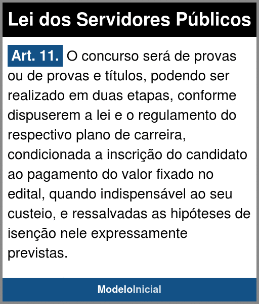Art. 11. O concurso será de provas ou de provas e títulos, podendo ser realizado em duas etapas, conforme dispuserem a lei e o regulamento do respectivo plano de carreira, condicionada a inscrição do candidato ao pagamento do valor fixado no edital, quando indispensável ao seu custeio, e ressalvadas as hipóteses de isenção nele expressamente previstas.