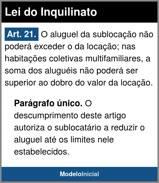 Art. 21. O aluguel da sublocação não poderá exceder o da locação; nas habitações coletivas multifamiliares, a soma dos aluguéis não poderá ser superior ao dobro do valor da locação.