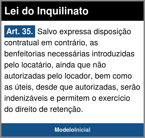 Art. 35. Salvo expressa disposição contratual em contrário, as benfeitorias necessárias introduzidas pelo locatário, ainda que não autorizadas pelo locador, bem como as úteis, desde que autorizadas, serão indenizáveis e permitem o exercício do direito de retenção.