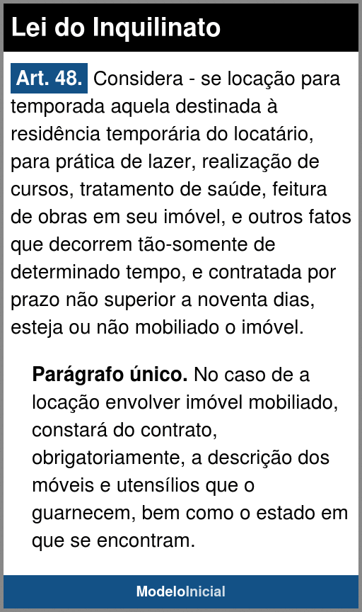 Art. 48. Considera - se locação para temporada aquela destinada à residência temporária do locatário, para prática de lazer, realização de cursos, tratamento de saúde, feitura de obras em seu imóvel, e outros fatos que decorrem tão-somente de determinado tempo, e contratada por prazo não superior a noventa dias, esteja ou não mobiliado o imóvel.