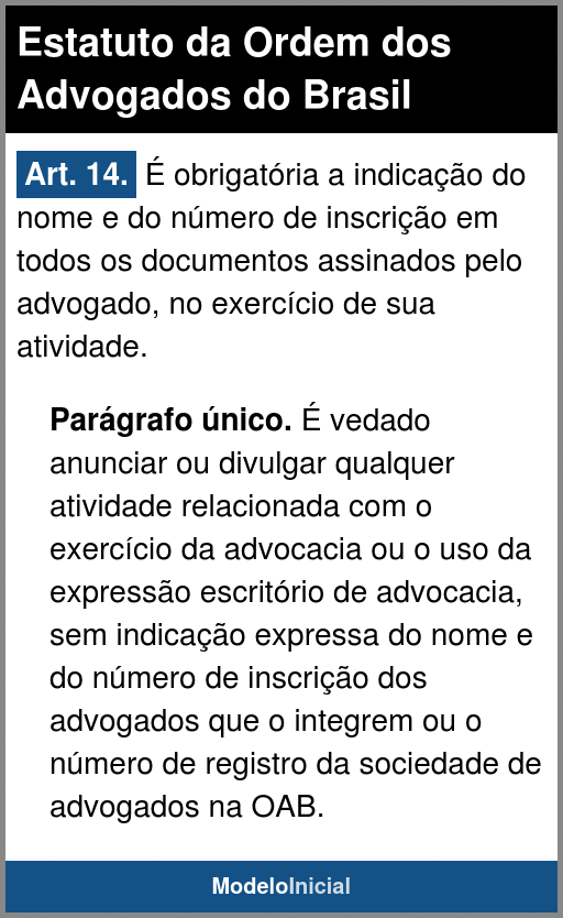 Art. 14. É obrigatória a indicação do nome e do número de inscrição em todos os documentos assinados pelo advogado, no exercício de sua atividade.