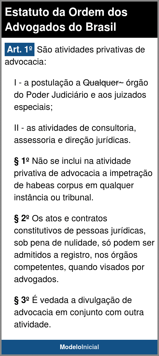 § 1º Não se inclui na atividade privativa de advocacia a impetração de habeas corpus em qualquer instância ou tribunal.