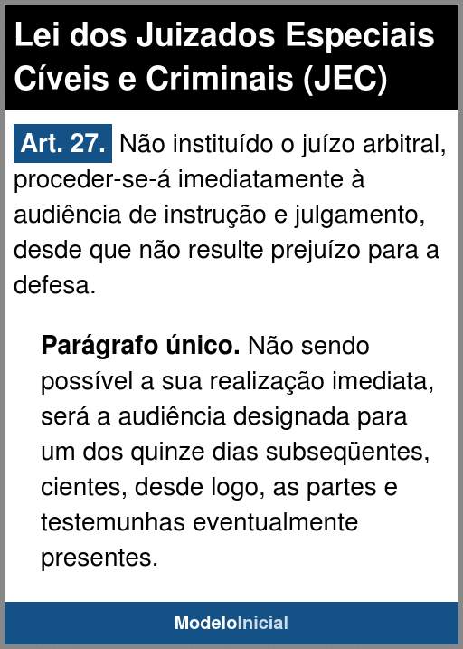 Art. 27. Não instituído o juízo arbitral, proceder-se-á imediatamente à audiência de instrução e julgamento, desde que não resulte prejuízo para a defesa.
