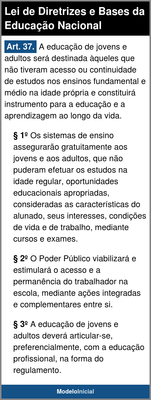 Art. 37. A educação de jovens e adultos será destinada àqueles que não tiveram acesso ou continuidade de estudos nos ensinos fundamental e médio na idade própria e constituirá instrumento para a educação e a aprendizagem ao longo da vida.