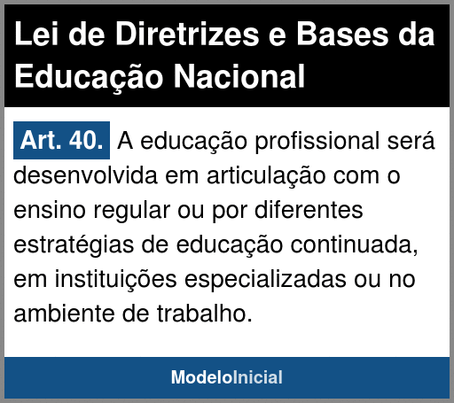 Art. 40. A educação profissional será desenvolvida em articulação com o ensino regular ou por diferentes estratégias de educação continuada, em instituições especializadas ou no ambiente de trabalho.