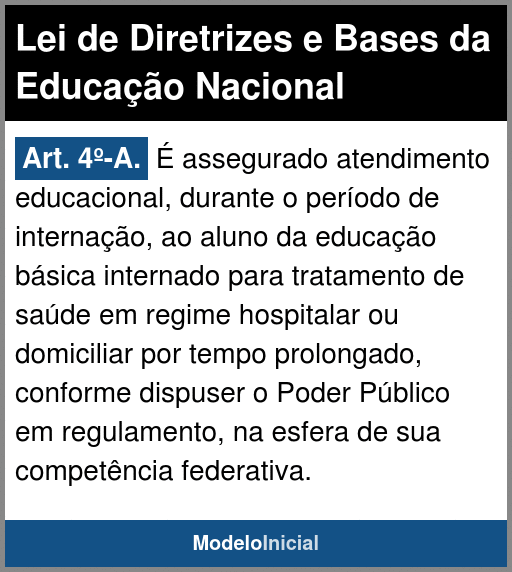 Art. 4º-A. É assegurado atendimento educacional, durante o período de internação, ao aluno da educação básica internado para tratamento de saúde em regime hospitalar ou domiciliar por tempo prolongado, conforme dispuser o Poder Público em regulamento, na esfera de sua competência federativa.