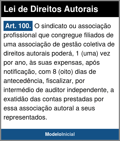 Art. 100. O sindicato ou associação profissional que congregue filiados de uma associação de gestão coletiva de direitos autorais poderá, 1 (uma) vez por ano, às suas expensas, após notificação, com 8 (oito) dias de antecedência, fiscalizar, por intermédio de auditor independente, a exatidão das contas prestadas por essa associação autoral a seus representados.