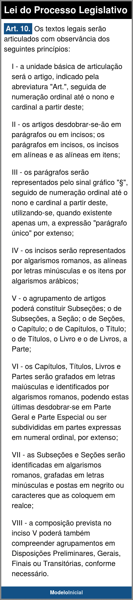 I - a unidade básica de articulação será o artigo, indicado pela abreviatura "Art.", seguida de numeração ordinal até o nono e cardinal a partir deste;