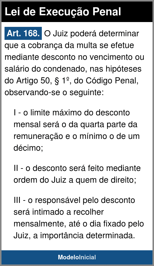 Art. 168. O Juiz poderá determinar que a cobrança da multa se efetue mediante desconto no vencimento ou salário do condenado, nas hipóteses do Artigo 50, § 1º, do Código Penal, observando-se o seguinte: