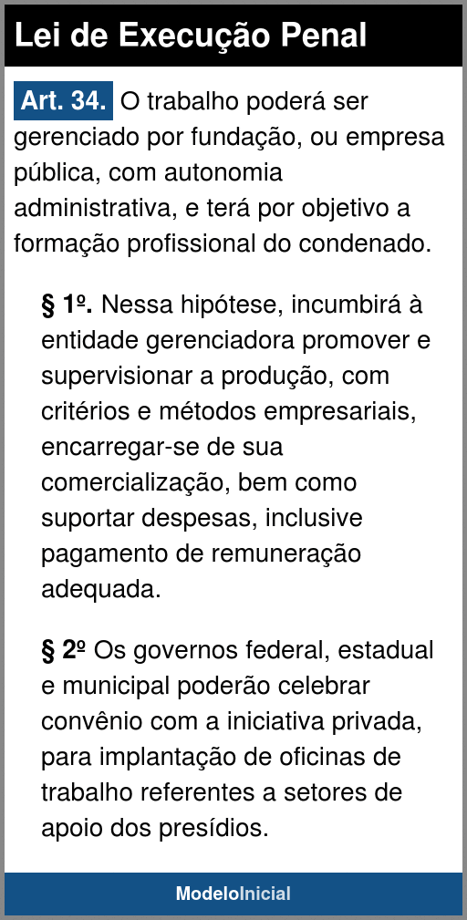Art. 34. O trabalho poderá ser gerenciado por fundação, ou empresa pública, com autonomia administrativa, e terá por objetivo a formação profissional do condenado.