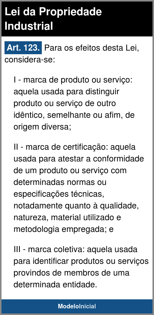 II - marca de certificação: aquela usada para atestar a conformidade de um produto ou serviço com determinadas normas ou especificações técnicas, notadamente quanto à qualidade, natureza, material utilizado e metodologia empregada; e