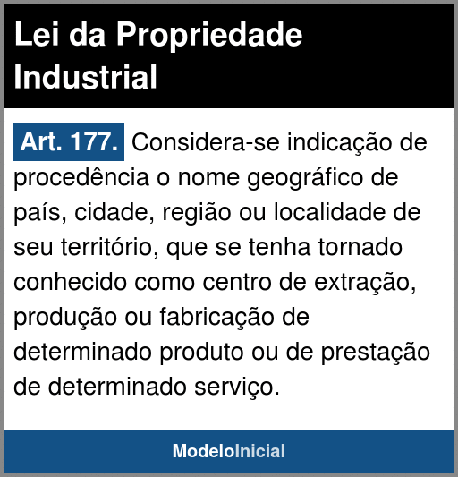 Art. 177. Considera-se indicação de procedência o nome geográfico de país, cidade, região ou localidade de seu território, que se tenha tornado conhecido como centro de extração, produção ou fabricação de determinado produto ou de prestação de determinado serviço.