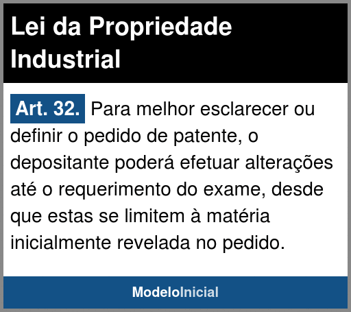 Art. 32. Para melhor esclarecer ou definir o pedido de patente, o depositante poderá efetuar alterações até o requerimento do exame, desde que estas se limitem à matéria inicialmente revelada no pedido.